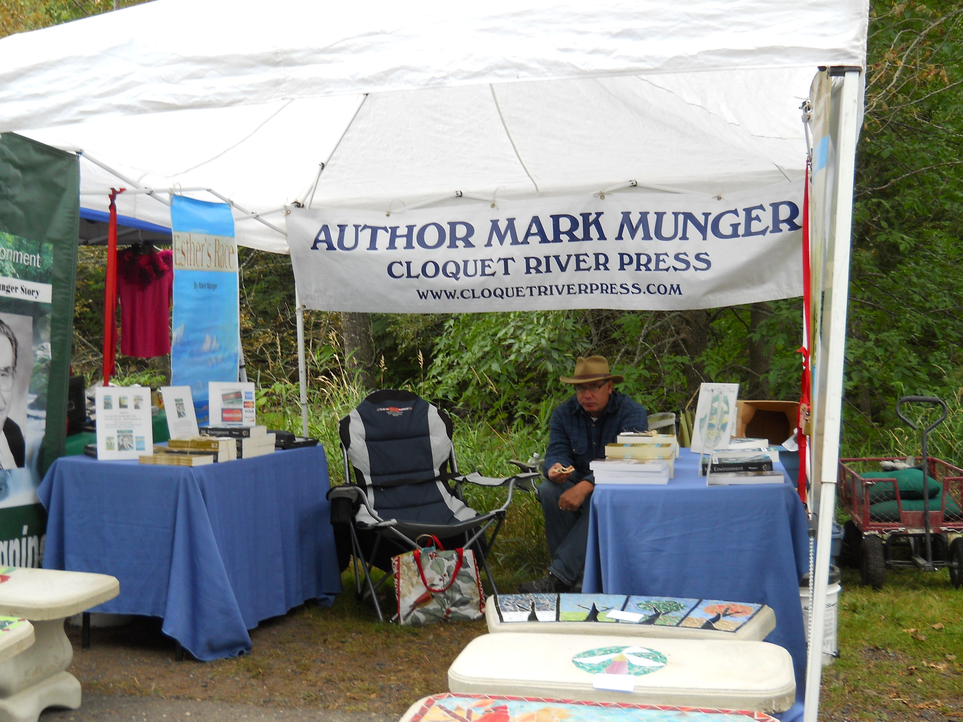 It’s drizzling outside. Soft, cold rain patters dying grass and slides over the steel siding of our farmhouse overlooking the Cloquet River. All night long, the residue of a tough week, a week spent in trial, a week spent moving 800 copies of Mr. Environment from a rented storage unit to a recently vacated bedroom in our home’s lower level (with another 800 copies awaiting similar transit), and a flurry of heavy lifting involving Rene’s concrete mosaic benches into the Pacifica for the Fall Festival in Duluth’s Chester Bowl, reminded me that this author stuff, at least the way I’ve been at it since I plunked my white EZ-Up tent down on the hard asphalt of ManyPenny Avenue at the Apple Festival in Bayfield ten Octobers ago, isn’t for the faint of heart or the weak of spine. Advil hasn’t dented the pain in my neck or the constant throbbing in my left heel, the result of too much weight, too much torque, too much lifting. After a fitful night spent on the couch trying to snare sleep, I yield: God (or common sense) has spoken.